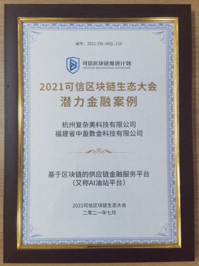 2021年,复杂美在区块链产业应用上,也更进一步。基于区块链的供应链金融服务平台(AI油站平台),入选中国国际经济技术合作促进会,数字科技发展工作委员会编撰的“2021年中国数字科技及区块链技术典型案例”。
