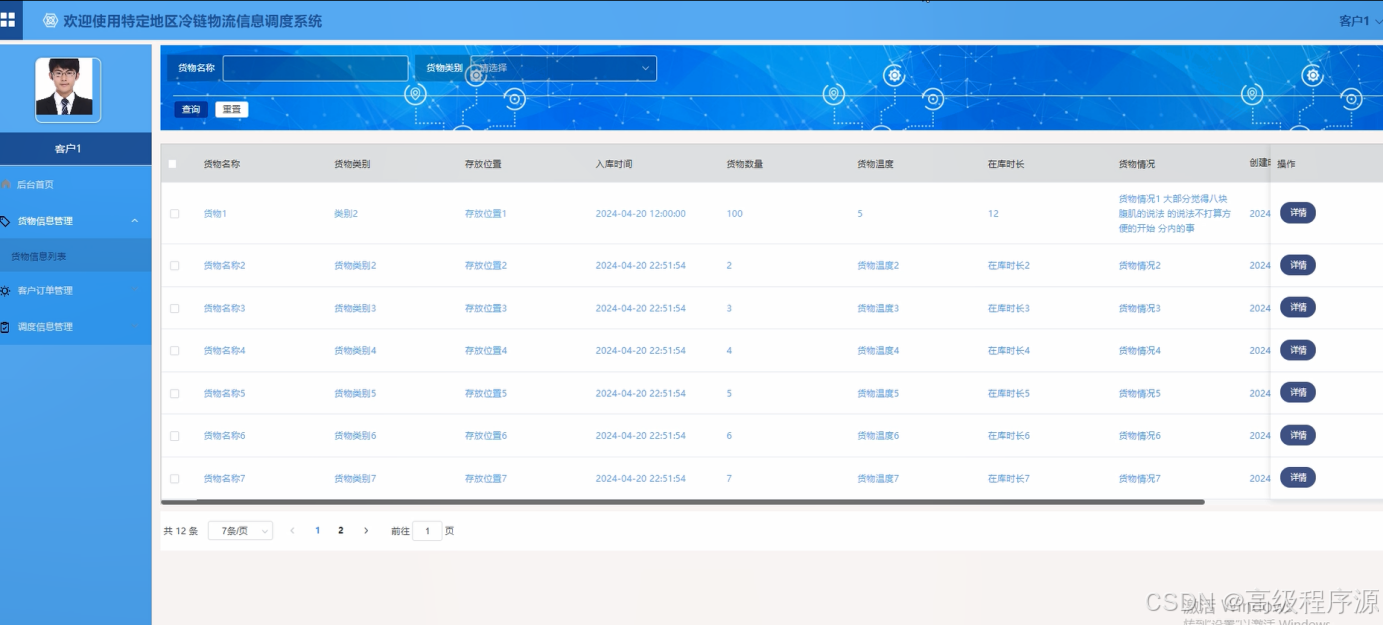 货物信息管理:提供货物信息的管理功能,包括查看货物名称、货物类别、存放位置、入库时间、货物数量、货物温度、在库时长、货物情况等操作,让客户能够实时了解货物运输情况。