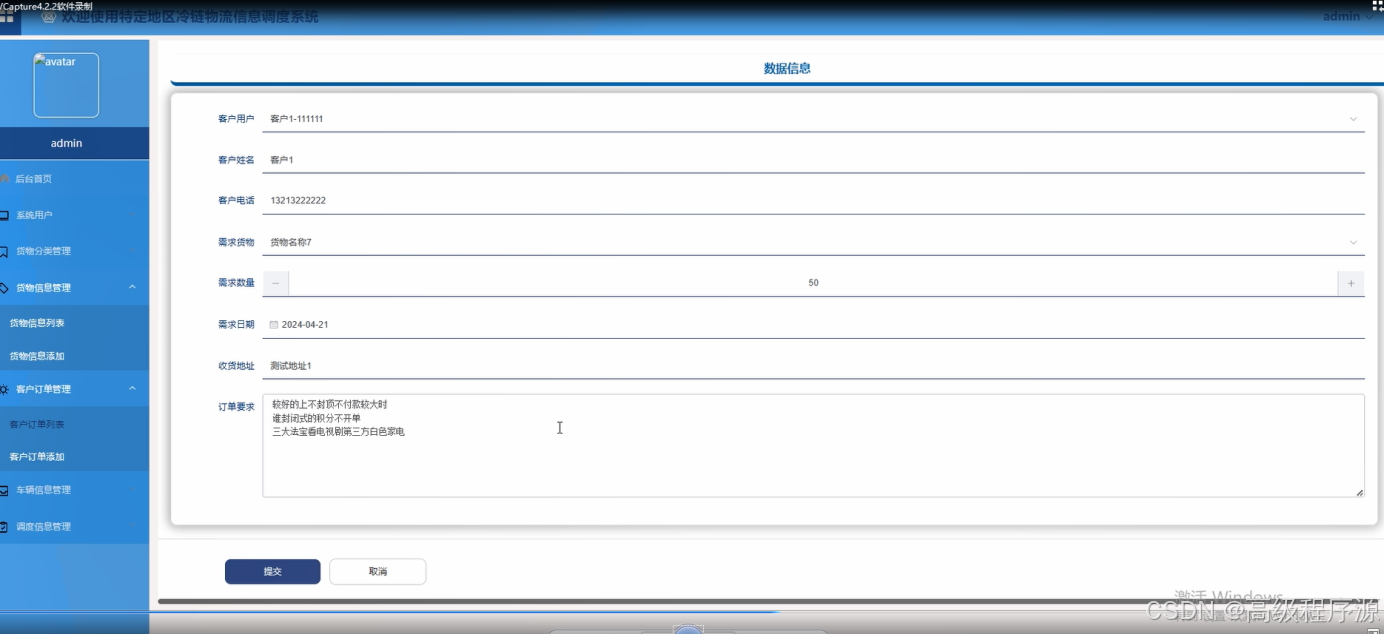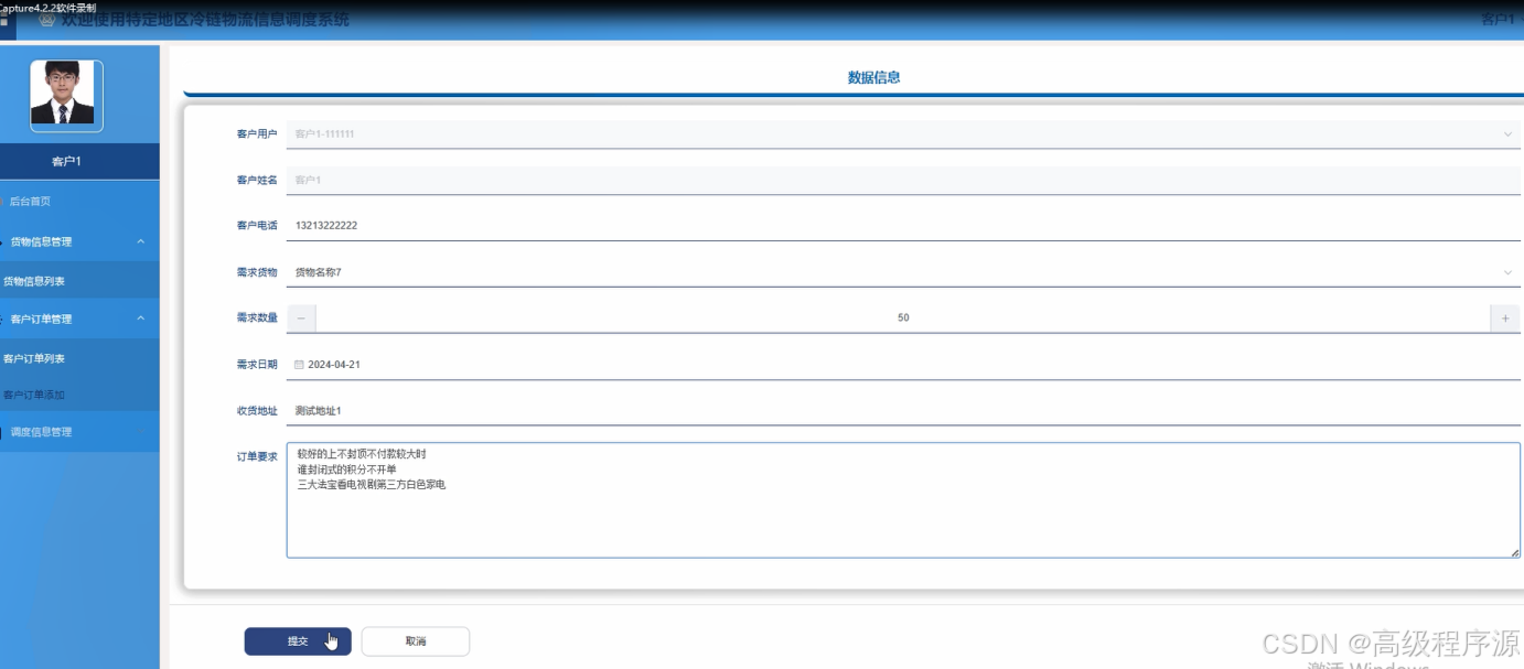 允许管理员管理客户订单信息,包括查看订单状态、增加新的订单信息、删除订单信息、处理异常订单等操作,确保订单的及时处理和客户满意度。客户订单管理界面如下图所示。