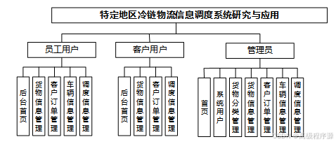 特定地区冷链物流信息调度系统研究与应用中采用了Python的Django框架进行开发,在数据库上选择MYSQL,在功能上特定地区冷链物流信息调度系统研究与应用划分为了员工用户、客户用户和和管理员这三大部分。功能需求分析如下: