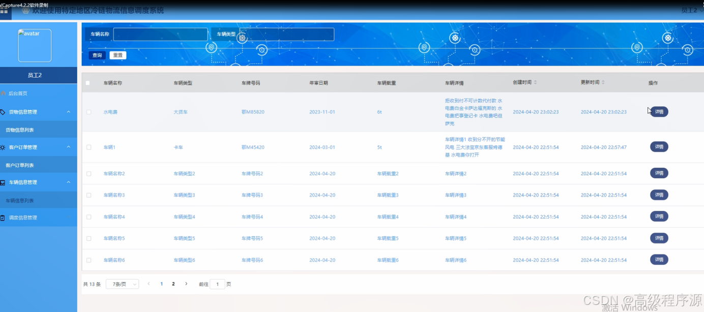 车辆信息管理:提供车辆信息的管理功能,包括查看年辆名称、车辆类型、车牌号码、年审日期、车辆详情等,确保物流运输过程中车辆资源的有效利用。