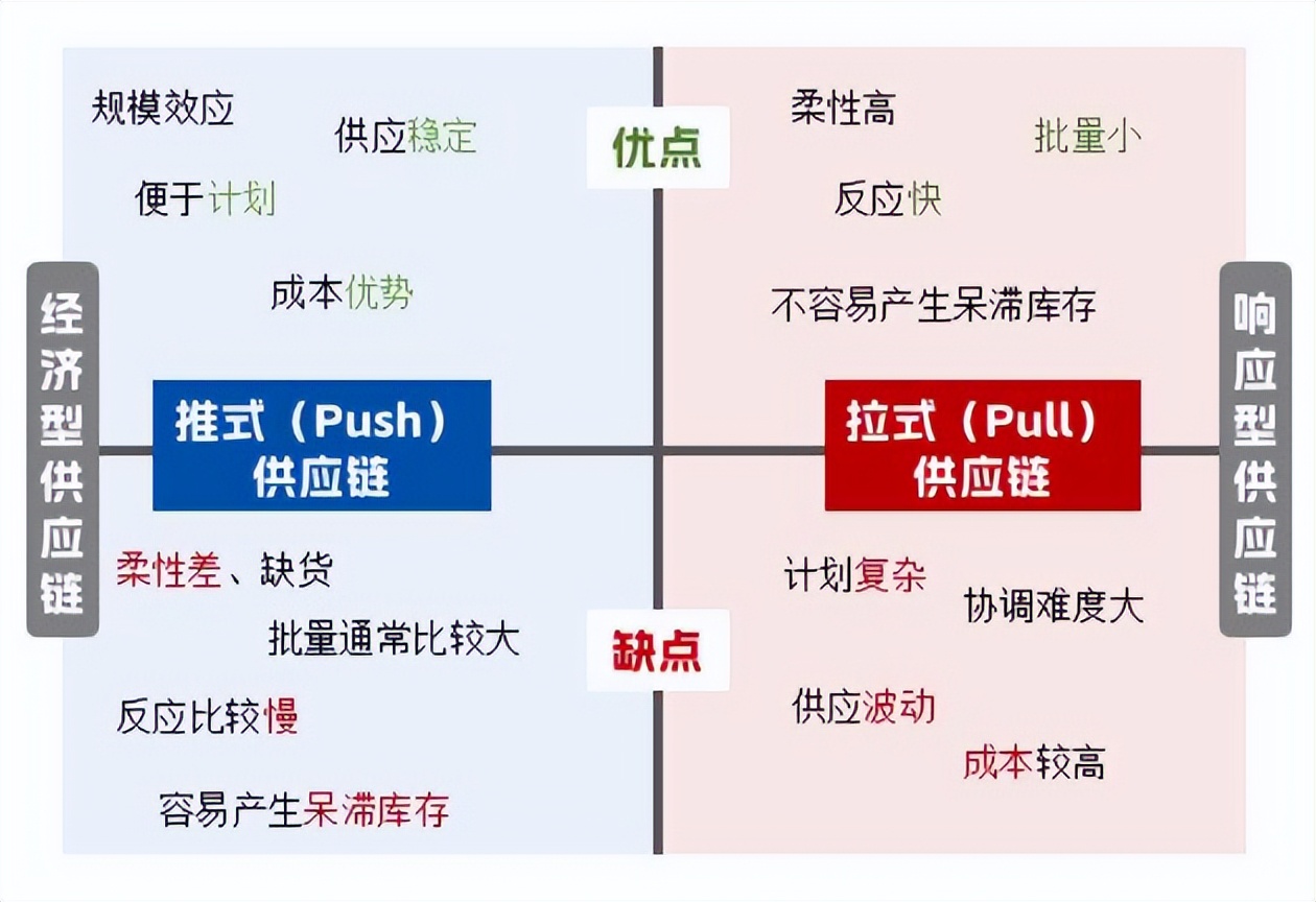 推动式供应链是以制造商为核心企业,根据产品的生产和库存情况,有计划地把商品推销给客户,其驱动力源于供应链上游制造商的生产在这种运作方式下,供应链上各节点比较松散,追求降低物理功能成本,属卖方市场下供应链的一种表现。由于不了解客户需求变化,这种运作方式的库存成本高,对市场变化反应迟钝。