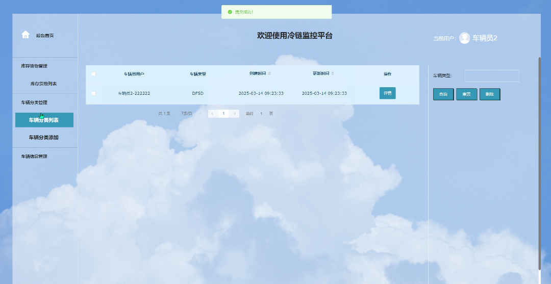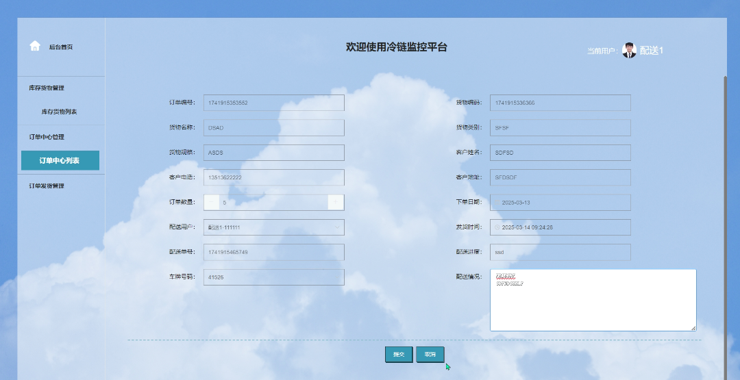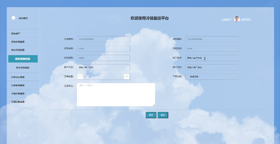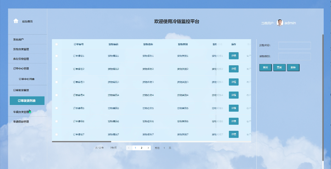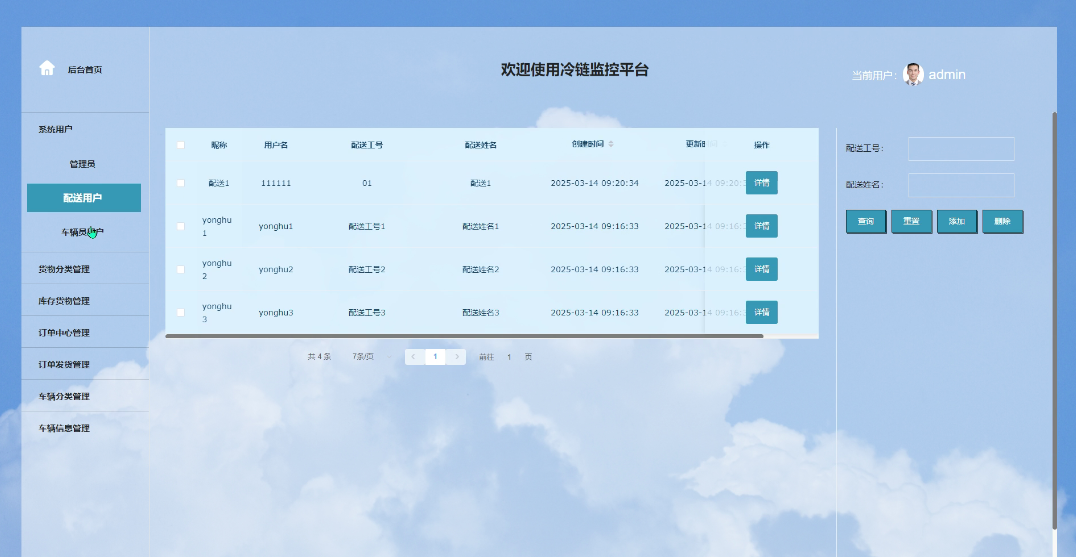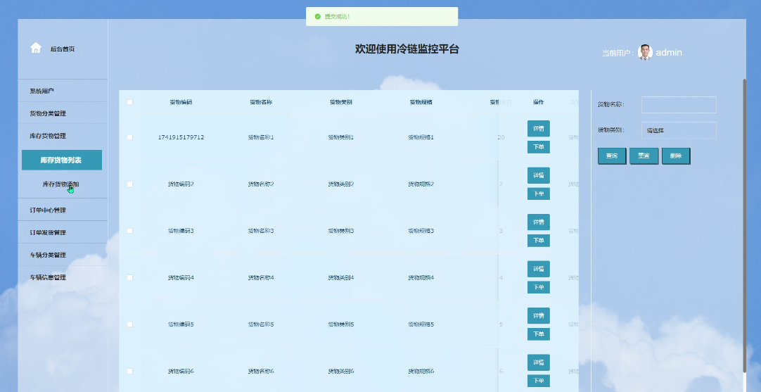 本系统采用SpringBoot框架实现业务逻辑和数据处理,数据库选用MySQL进行数据存储与管理。系统分为配送用户、车辆员用户和管理员三大核心部分,主要涵盖了系统用户、货物分类管理、库存货物管理、订单中心管理、订单发货管理、车辆分类管理以及车辆信息管理等功能,实现对货物订单信息的全面管理。该平台不仅能有效实现对冷链物流的实时监控和管理,还能提升各类用户的操作体验,最终为冷链物流行业的精细化和信息化