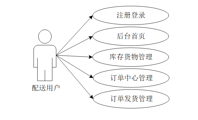 本冷链监控平台的配送用户角色模块主要包含注册登录、后台首页、库存货物管理、订单中心管理、订单发货管理等功能。配送用户角色用例图如下图3.1 所示。