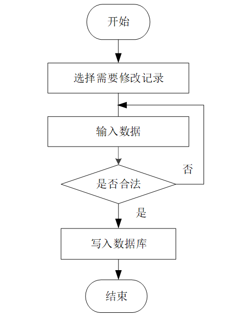 用户首先选择需要修改的记录,输入修改后的数据,系统判断输入数据是否合法。若数据不合法,提示重新输入;若数据合法,则将修改后的数据写入数据库,完成操作后流程结束。修改信息流程图如图4.4所示。