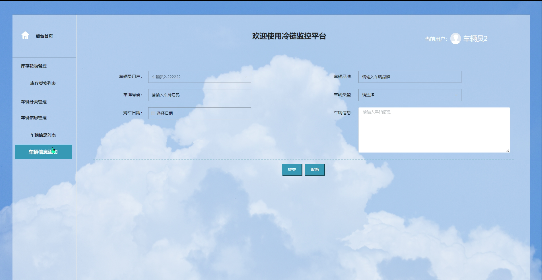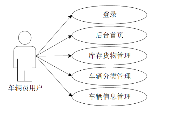 本冷链监控平台的车辆员用户角色模块含有登录、后台首页、、库存货物管理、车辆分类管理、车辆信息管理等功能。车辆员用户角色用例图如下图3.2 所示。