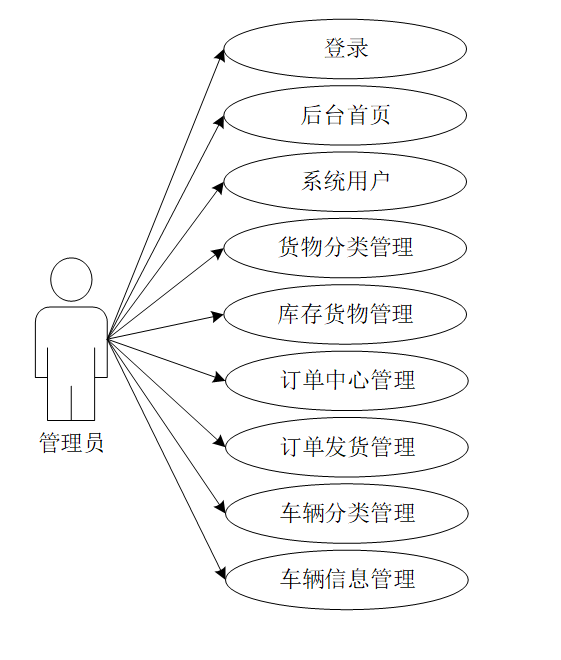 本冷链监控平台的管理员角色模块则涵盖了登录、后台首页、系统用户、货物分类管理、库存货物管理、订单中心管理、订单发货管理、车辆分类管理、车辆信息管理等功能。管理员角色用例图如下图3.3 所示。