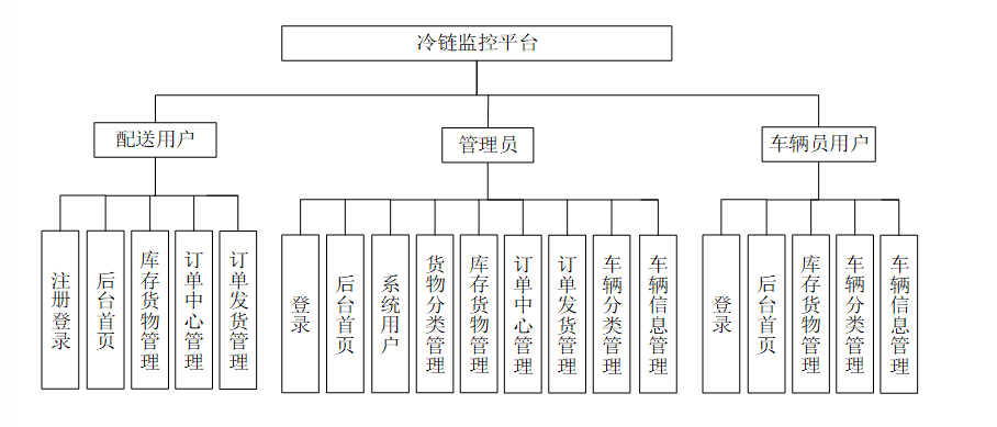 根据需求分析的结果,可以将冷链监控平台的功能划分为不同的模块。该系统主要可以划分为配送用户、车辆员用户和管理员三大模块,每个模块负责实现特定的功能,又可细分不同子模块,并与其他模块进行协作。本冷链监控平台的功能结构图如图4.6所示。