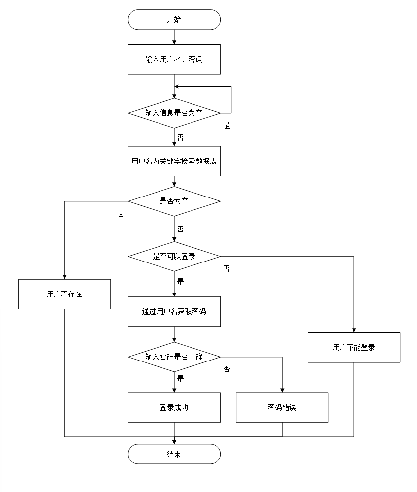 用户输入用户名和密码后,系统先检查输入是否为空,再验证用户名是否存在,若存在则通过用户名获取密码并校验。若密码正确则登录成功,否则提示密码错误。若用户名不存在或无法登录,提示用户操作无效。如图4.2所示。