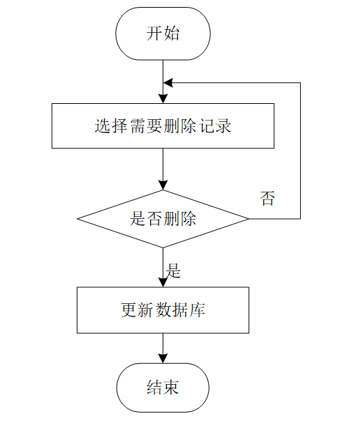 用户选择需要删除的记录后,系统判断是否确认删除。若未确认,返回选择环节;若确认删除,则更新数据库,删除对应记录,完成操作后流程结束。删除信息流程图如图4.5所示。