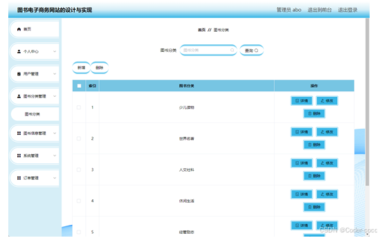 管理员可以对图书分类信息进行添加,修改,删除,查询操作。