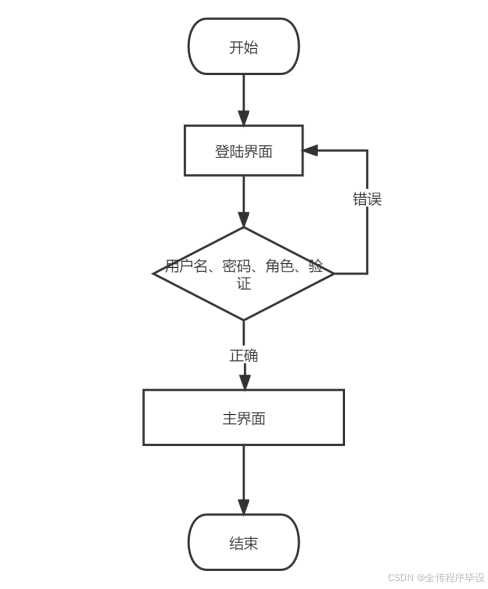 进入登录界面后,输入用户名和密码,选择角色后验证,如果正确进入主界面,否则需要重新输入。登录流程如图3-6所示[11]。