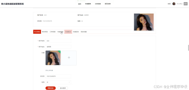 在个人中心页面可以输入个人详细信息,进行信息更新,还可以对修改密码、订单信息、快递信息、快递配送、快递签收、我的收藏等进行详情操作;如图5-5所示: