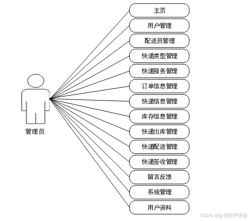 铁小道快递配送管理系统可以将功能划分为用户、配送员的使用功能和管理员功能。