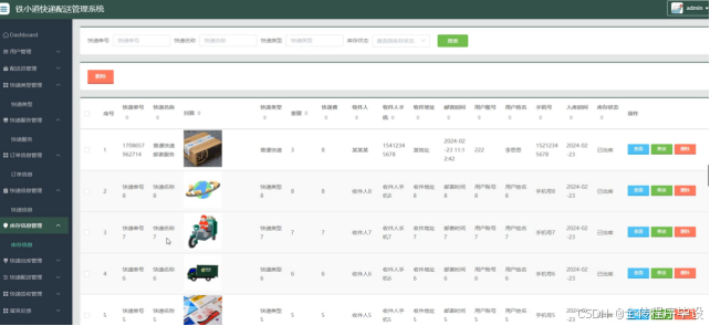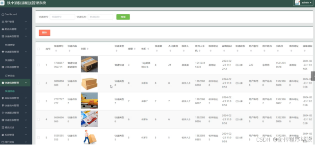快递信息管理:管理快递包裹的详细信息,包括快递单号、收件人信息、寄件人信息、重量、体积等。