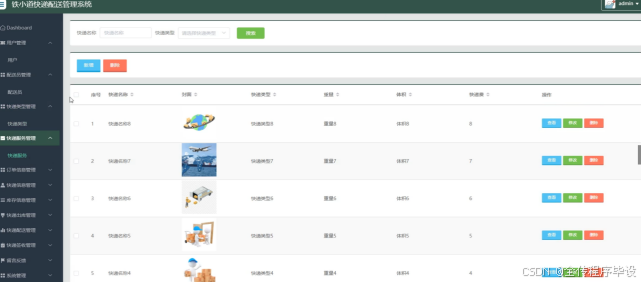 管理员点击快递服务管理,在快递服务管理页面对快递名称、封面、快递类型、重量、体积、快递费等信息,进行搜索、新增或删除快递服务等操作。如图5-11所示: