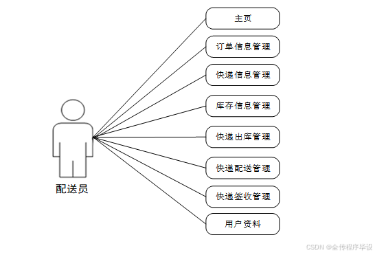 (2)配送员关键功能包含主页、订单信息管理、快递信息管理、库存信息管理、快递出库管理、快递配送管理、快递签收管理、用户资料等有关信息,并进行详细操作。配送员用例如下: