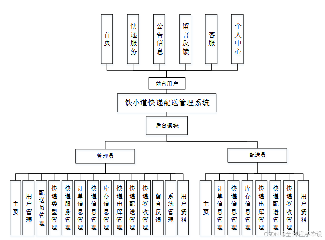 铁小道快递配送管理系统分为三个模块,分别是管理员功能模块和用户、配送员功能模块。主要功能模块包括:主页、用户管理、配送员管理、快递类型管理、快递服务管理、订单信息管理、快递信息管理、库存信息管理、快递出库管理、快递配送管理、快递签收管理、留言反馈、系统管理、用户资料等,系统总体功能如下图所示[12]。