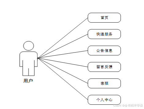 (1)用户关键功能包含用户注册登录,首页、快递服务、公告信息、留言反馈、客服、个人中心等有关信息,并进行详细操作。用户用例如下: