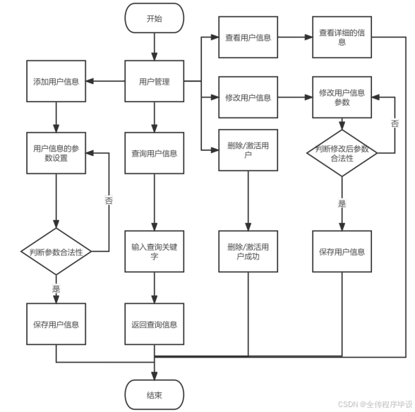 用户管理包括:添加用户信息,查看用户信息,修改用户信息,删除/激活用户信息。添加用户信息后设置用户信息的参数,如果参数合法,保存用户信息,否则需要重新设置参数;查询用户信息需要输入查询关键字,然后返回查询信息;查看用户信息就可以查看详细的信息;修改用户信息需要修改参数,如果修改后的参数合法,保存用户信息,否则需要重新修改参数;删除/激活用户信息后删除/激活用户信息成功[9]。用户管理的流程如图3-4所示。