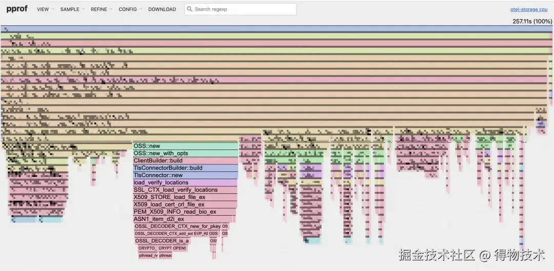 在我们的 CPU 火焰图中,一个令人意外的瓶颈浮出水面:OSS::new 占用了约 19.1% 的 CPU 时间。深入分析后发现, OSS::new 内部的 TlsConnector 在每次新建连接时都会进行 TLS 握手,这是导致 CPU 占用过高的根本原因。