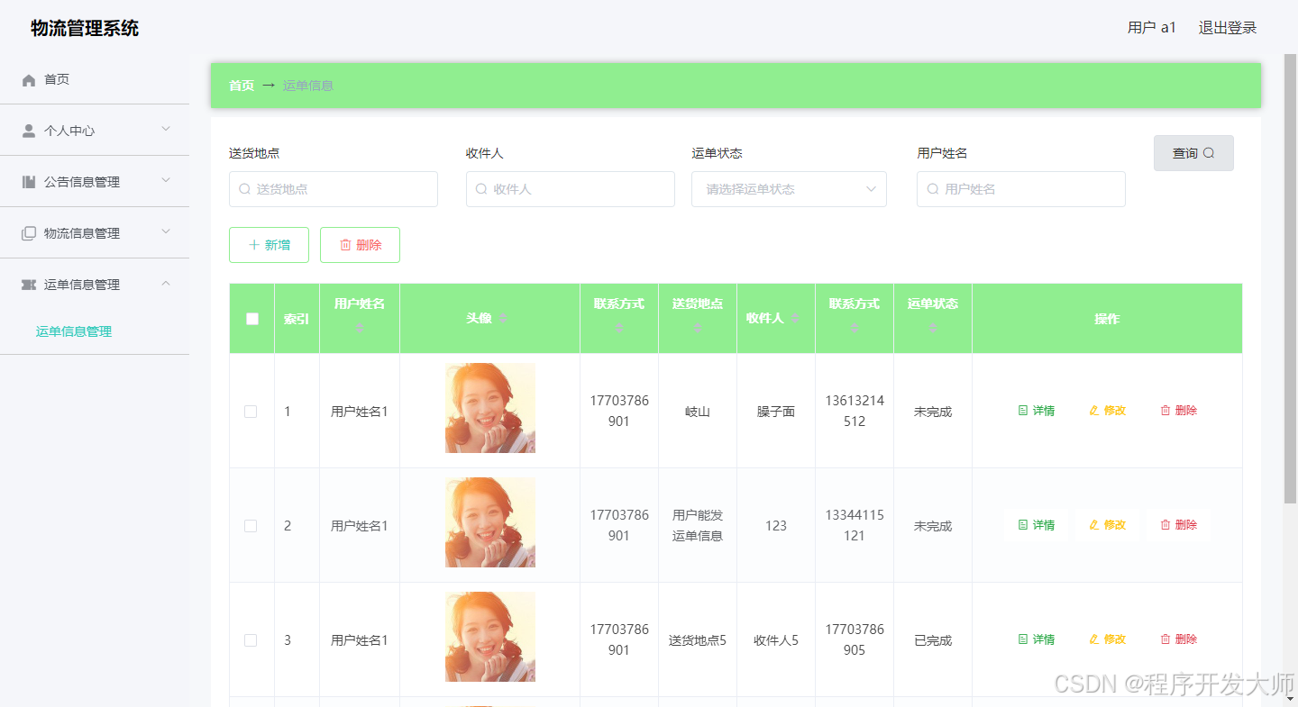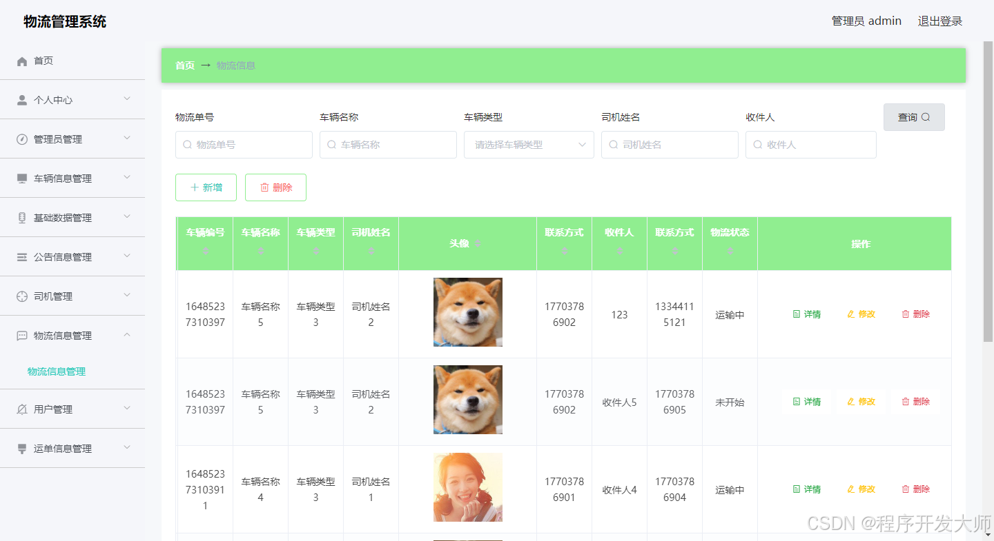 管理员可以对物流信息进行添加,修改,删除,查询操作。