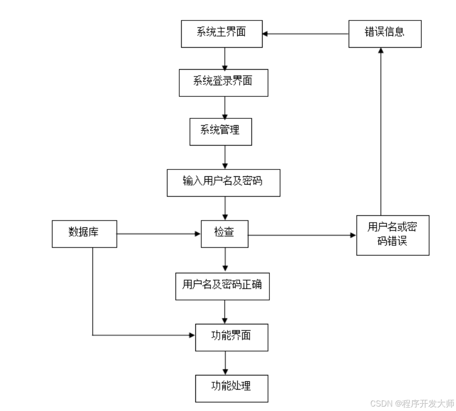 分析程序的流程,涉及到程序的整体操作流程,通过分析与设计,绘制的程序操作流程图见下图。此程序为了确保安全,会让使用者通过登录模块验证信息,符合要求的使用者才有权限操作程序。