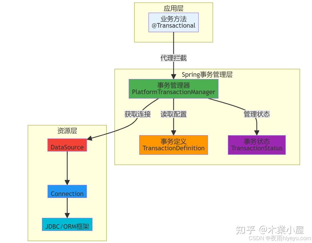 在现代企业级应用开发中,数据一致性是系统的生命线。🛒扣减库存:商品库存减1💰创建订单:生成订单记录💳扣款处理:用户账户余额扣减📦物流信息:生成物流单号如果其中任何一步失败,整个操作都应该回滚,否则就会出现”库存扣了但订单没创建”的严重数据不一致问题。Spring Boot的事务管理机制正是为了解决这类问题而设计的。🏗️ 一、Spring事务管理基础架构1.1 事务管理核心组件架构事务传播
