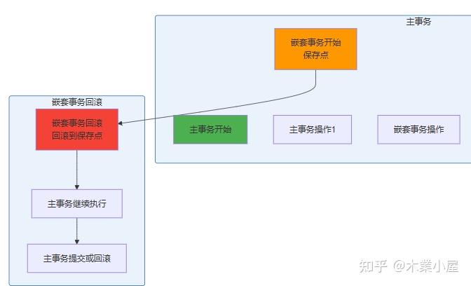 嵌套事务通过保存点机制实现,它不是真正的事务嵌套,而是在同一物理事务中设置逻辑回滚点。 保存点机制: