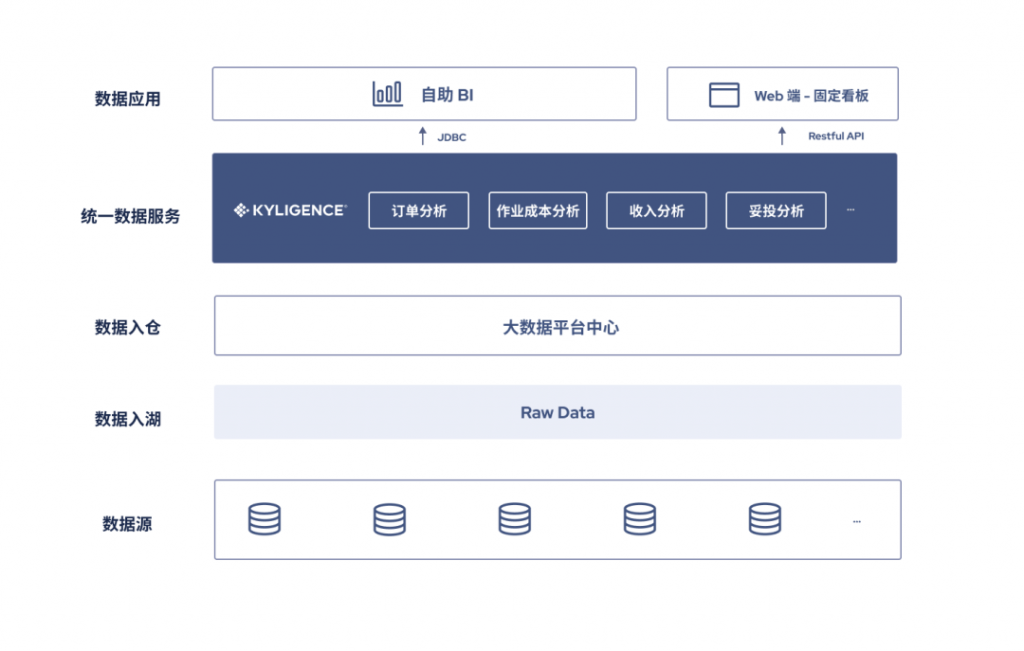 - 统一数据服务:通过 Kyligence Enterprise 进行多维数据建模,构建统一业务语义层。通过 JDBC 和 Restful API 集成 FineBI 以及 Web 端自研报表系统等数据应用,用户可以灵活进行自助分析以及看板的制作,满足订/运单收入分析、客户体验满意度分析等多种 OLAP 场景;