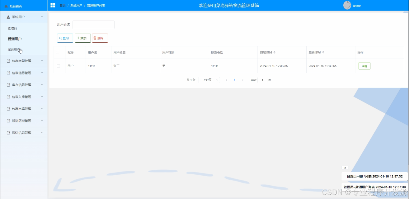 派送信息管理:添加派送信息,包括派送用户、用户姓名、用户性别、联系电话、派送区域、信息备注等。