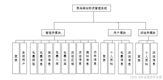 菜鸟驿站物流管理系统根据需求解析,主要分为管理员、用户和派送员三个模块,每个模块下又包含不同的分支功能。以下是对各个模块功能的详细说明: