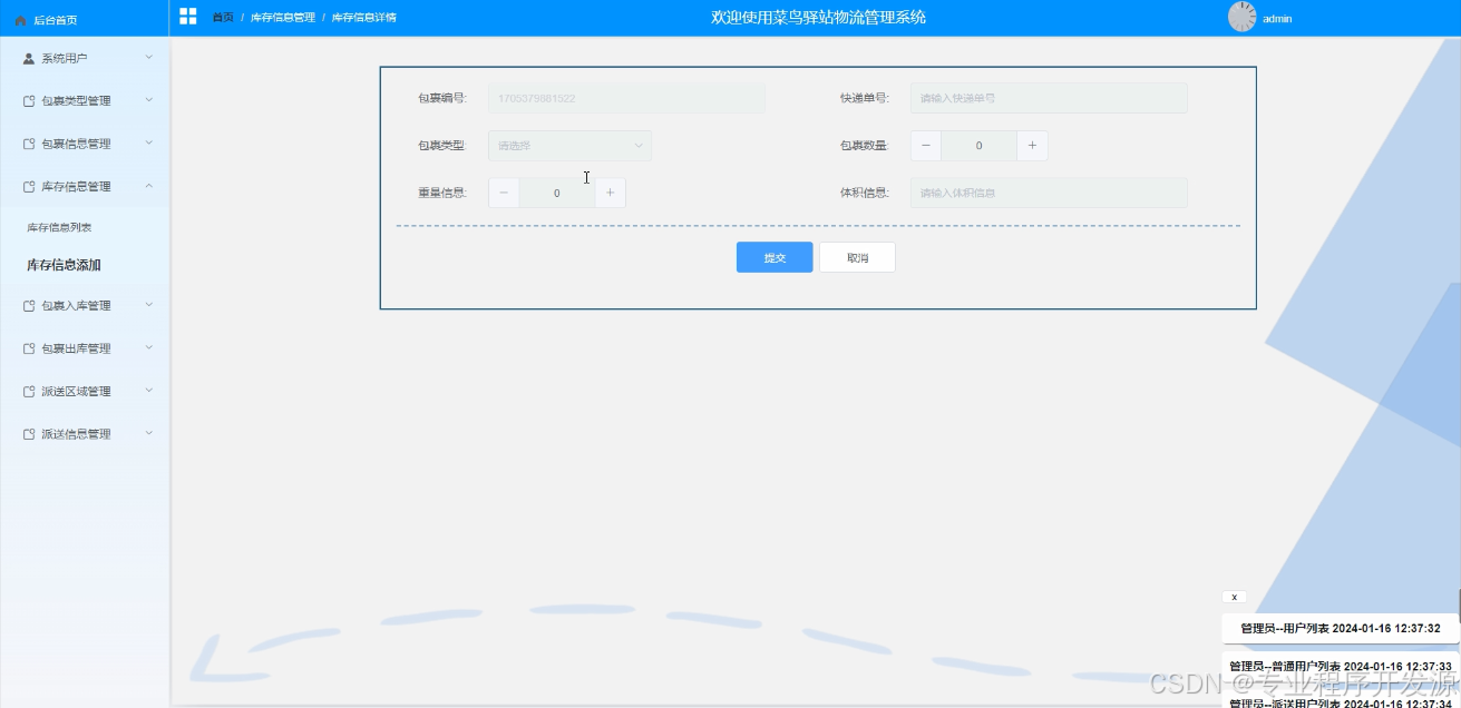 库存信息管理:添加包裹编号、包裹类型、快递单号、包裹数量、重量信息、体积信息,可进行查询、删除库存信息等操作。