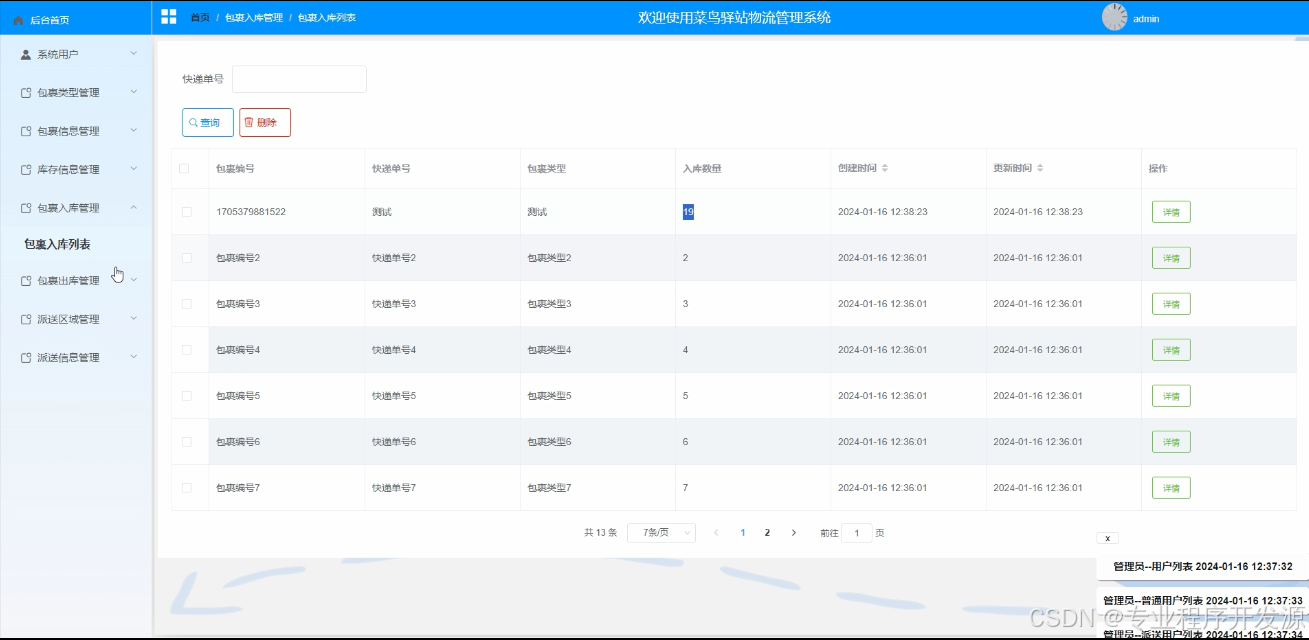 包裹入库管理:查询、删除包裹库存信息,管理入库数量等操作。