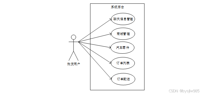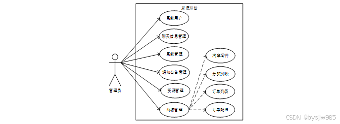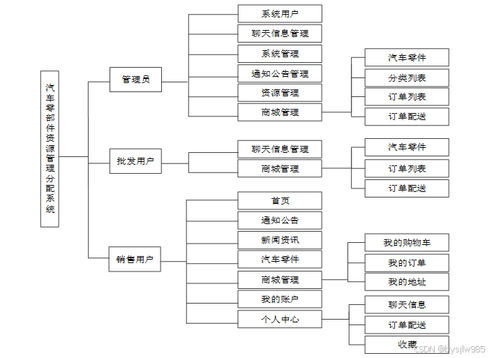 本汽车零部件资源管理分配系统的设计主要是针对四种用户进行使用,第一种是以游客身份使用,游客在进入系统后可以查看到系统中的所有内容,包括首页、通知公告、新闻资讯、汽车零件、商城管理,如果想要评论或者购买,可以注册登录;第二种是注册之后有账号的用户,登录以后可以收藏、评论、购买、管理收货地址、订单、个人资料等;第三种则是批发批发用户,商家用在后台能够进行商城管理,添加新的汽车零部件商品和对用户的订单信息进行配送处理、回复用户的聊天信息;第四种是管理员,是系统的管理者,管理员对系统中的系统用户、聊天信息管理、系统管理、通知公告管理、资源管理、商城管理进行整体把控。