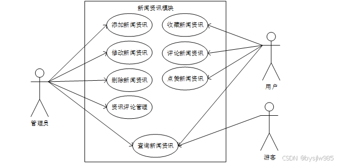 (2)新闻资讯模块:游客可以查看新闻资讯,用户可以收藏、评论、点赞新闻资讯信息,管理员可以添加、修改、删除新闻资讯,管理评论。新闻资讯模块用例如下图2-2所示。