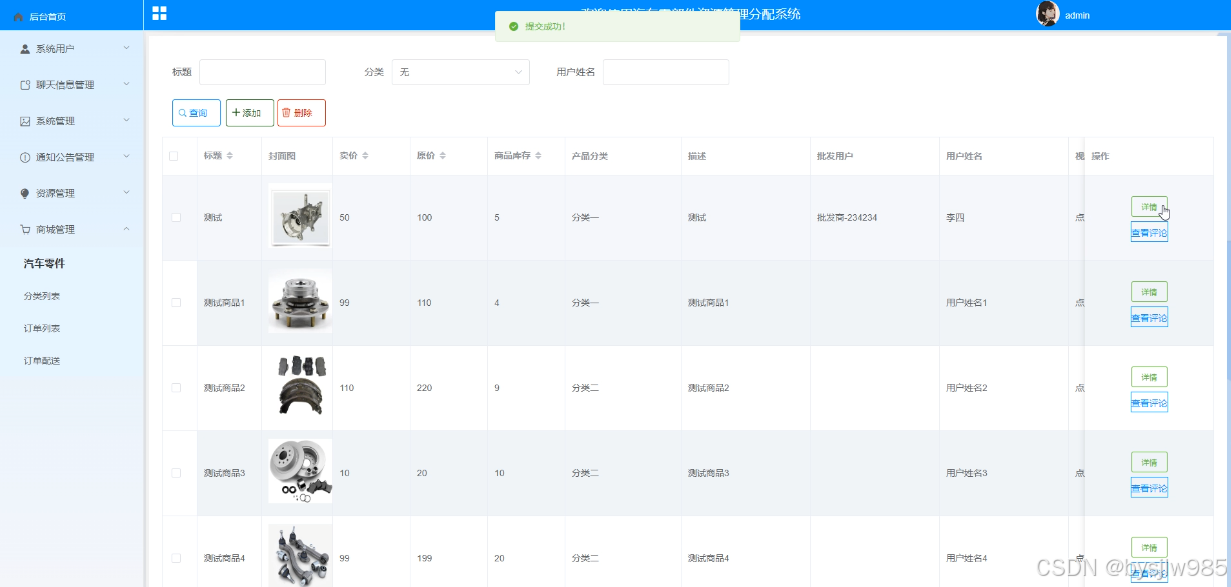 管理员拥有对汽车零件中的商品进行添加、修改、删除、管理评论的功能,汽车零件管理界面如下图4-16所示。