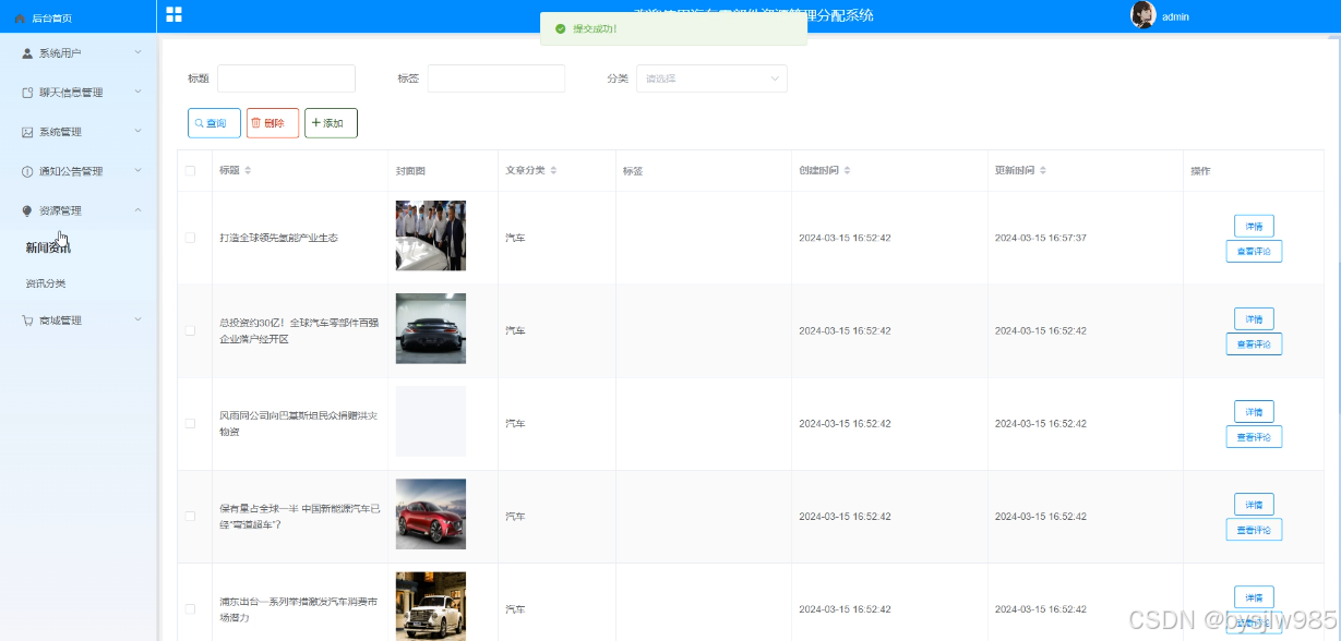 管理员点击“资源管理”可以对前台展示的新闻资讯以及资讯所属分类进行管理,新闻资源管理的界面如下图4-15所示。
