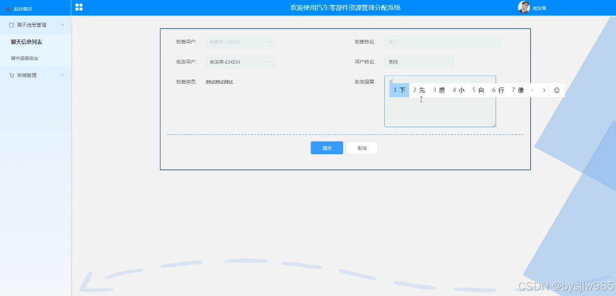 批发用户通过管理员在后台添加的账号信息进行登录系统,登录之后可以对个人信息、密码和聊天信息管理、商城管理(汽车零件、订单列表、订单配送)进行管理,批发用户只可查看自己的订单信息。批发用户回复聊天信息界面如下图4-12所示。