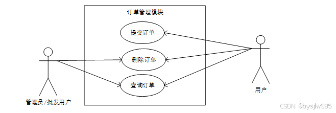 (6)订单管理模块:订单管理模块是前台用户和后台批发用户、管理员都有的功能,前台用户可以提交订单,管理订单,商家和管理员能够对用户订单进行管控。订单管理模块用例如下图2-6所示。