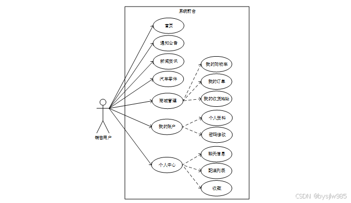 汽车零部件资源管理分配系统的前端主要是对系统信息的查看、收藏、评论以及对商品的购买,购买的过程中需要对收货地址进行设置,对购物车进行管理,查看自己的订单。前台销售用户用例图如图2-8所示。